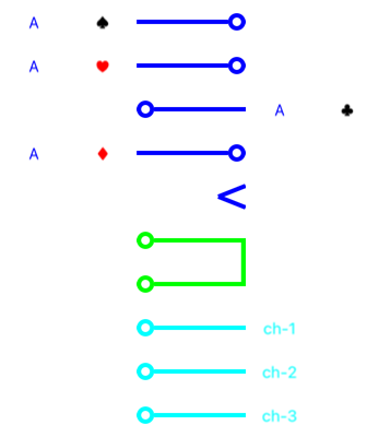 a sequence of cards (aces) on top of a deck, all face down |