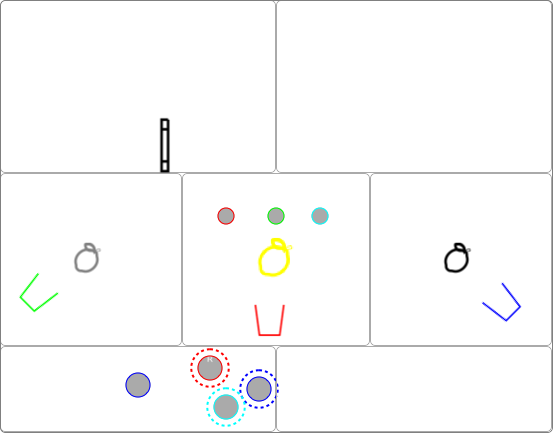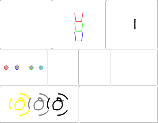 The notation for the Cups and Balls theme addresses the objects, the spaces where they are set into action, and focus and flow. Routines are described as a sequence of position checks each one rendered by a composed symbolic view.